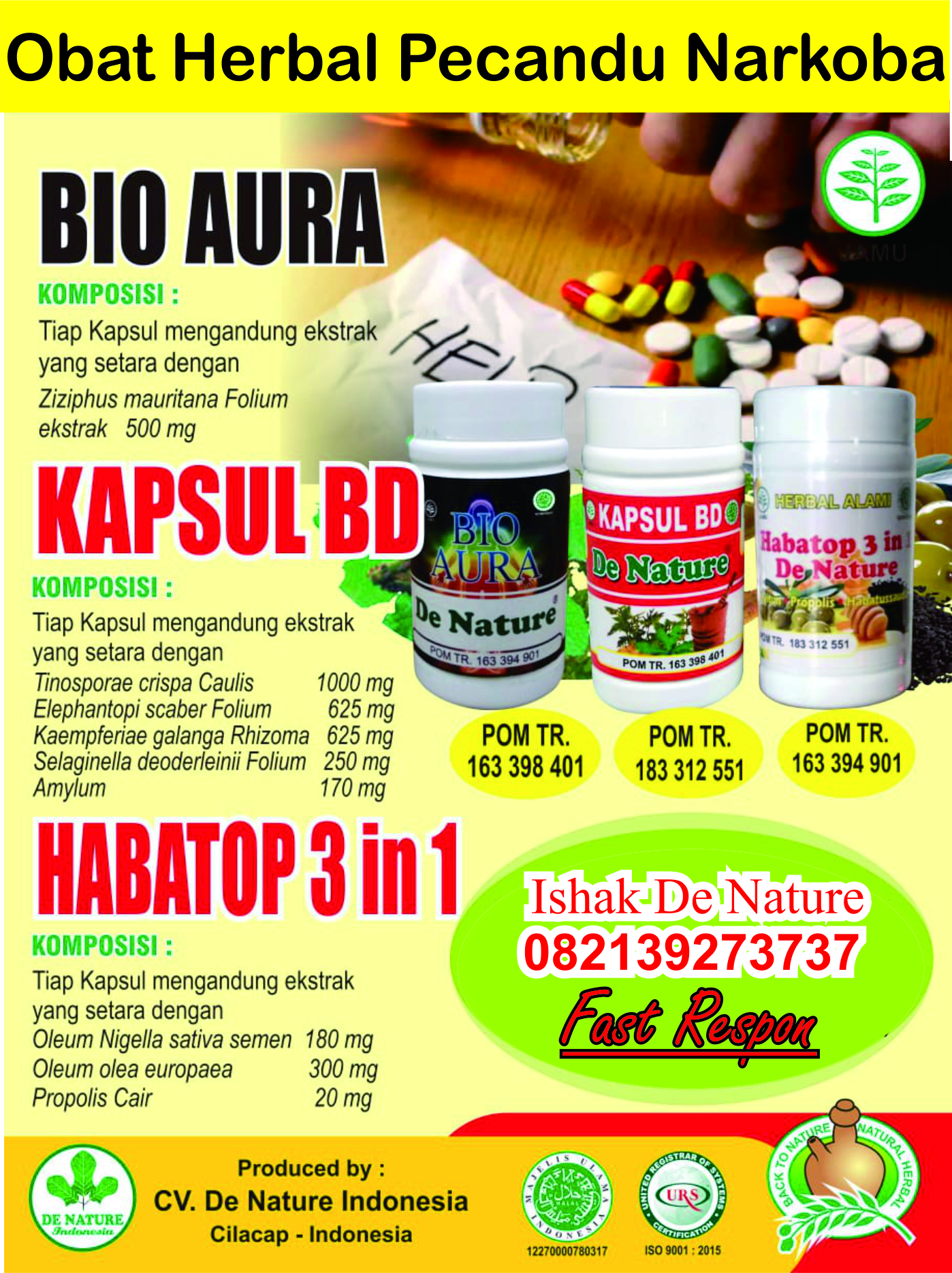 Kami De Nature Indonesia menjual Obat Untuk Pecandu Narkoba yang bisa mengurangi kecanduan narkoba dan bisa memperbaiki sel saraf saraf yang telah rusak akibat bahan kimia yang terkndung dalam Narkoba.